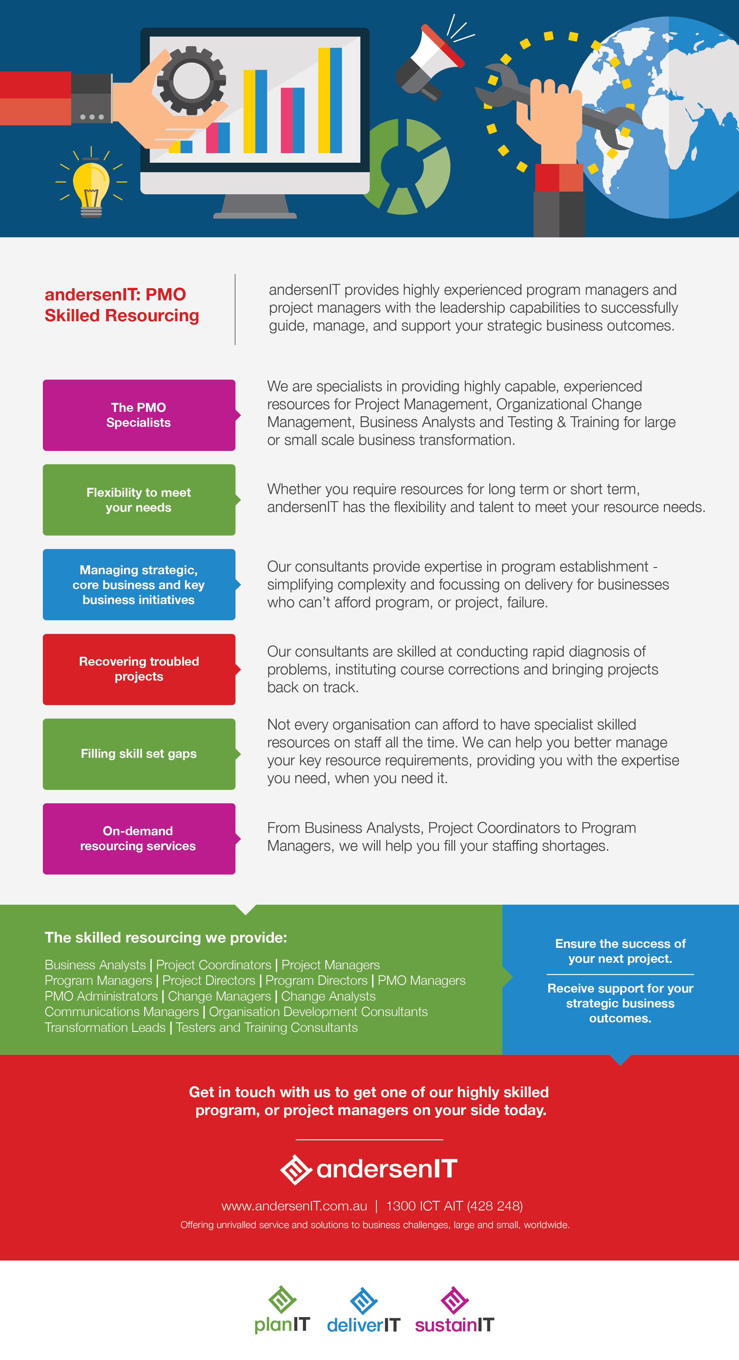 andersenIT provide highly experienced program managers and project managers to successfully guide, manage and support your strategic business outcomes.